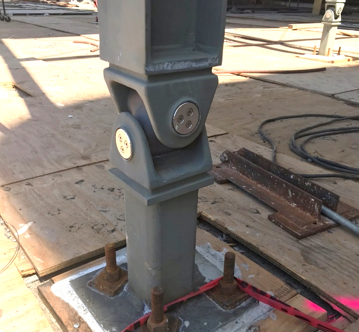 The bottom and sides of the spherical structure around the new Geffen Theater are constructed from reinforced concrete that is clad with precast concrete panels. The flat top of the sphere that forms the Dolby Terrace is structured with a steel frame that completes the form and ties the sidewalls of the sphere together. The connections between the historic Saban Building and the new Geffen Theater addition provided a difficult challenge for the structural engineer, Buro Happold, with the new Geffen addition utilizing a different lateral force resisting system, base-isolators, from the rest of the project. This system was the best structural option for achieving the bold architectural vision of the soaring spherical addition, but naturally it was not a feasible solution for the retrofit of the original Saban Building. Instead, the 1930s Saban Building’s steel and concrete structure underwent structural improvements to its lateral systems to meet today’s earthquake codes. These structural improvements included augmenting existing steel framing and the addition of concrete shear walls and collectors. The disparate lateral systems meant that the two buildings’ lateral movement was distinctly different from each other while still needing the connectivity of spaces provided by 3 bridges and exterior stairs. The solution was to design these interface conditions with flexible connections. At the stairs, specifically, Buro Happold utilized custom universal hinge connections designed in collaboration with CastConnex.