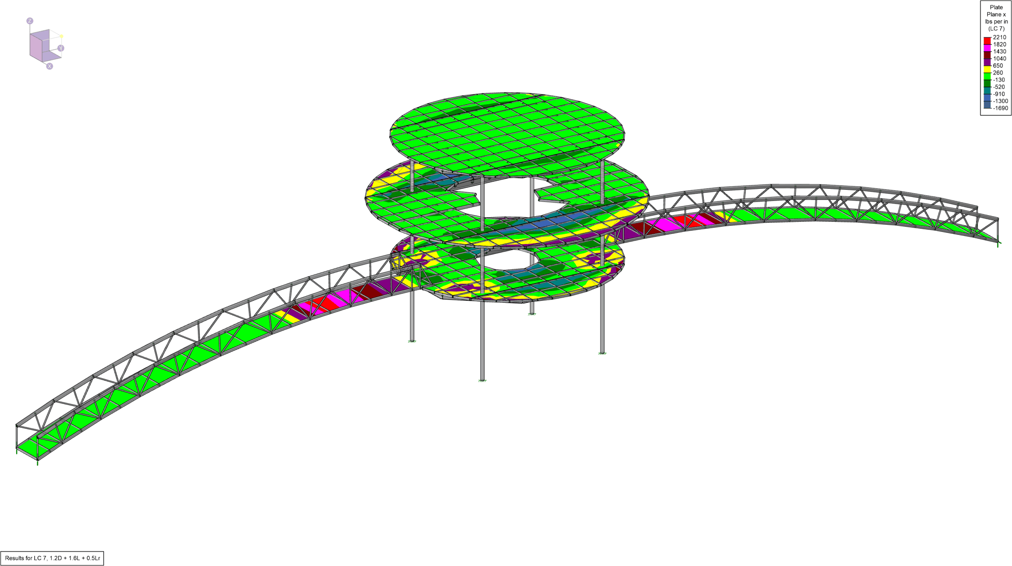 Engineers at Epiq Structural Solutions utilized RISA-3D to model and analyze the entire structure with specific attention paid to the pedestrian bridge and “waffle” floor system. The analysis of the pedestrian bridges were unique due to the fact that the loaded condition would cause the bridge to slide since it was not anchored to the ground. As a result, additional lateral loads were introduced into the model to account for the sliding. When designing the “waffle” floor system, rigid links were used in order to achieve proper connection and load distribution of members spanning over top of each other. Additionally, due to the floor systems modularity, RISA-3D was used to evaluate loads and determine the connections that would be required between each module. Finally, RISAConnection was employed to design standard gravity connections as well as simplified versions of the complex lateral moment connections.