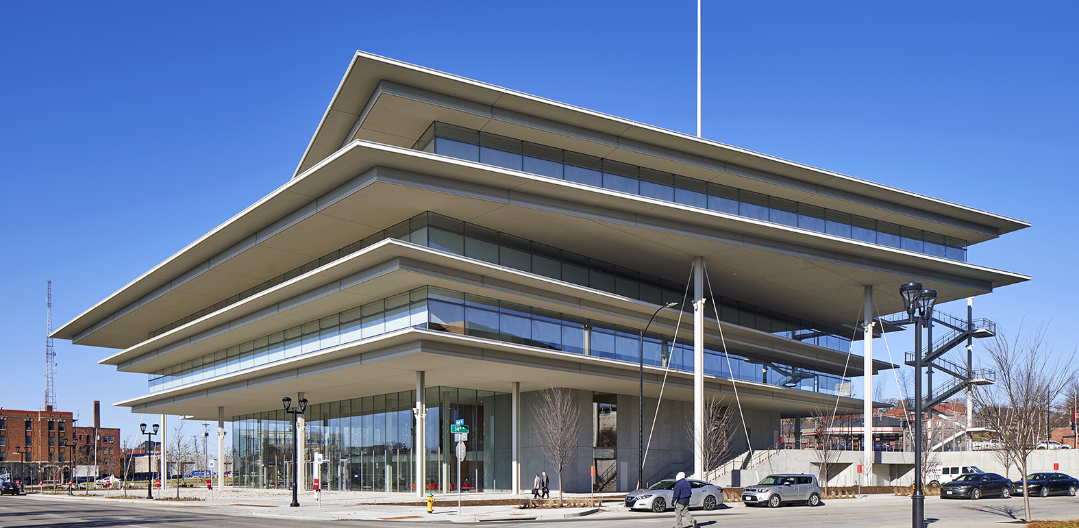 The new 6-story, Krause Gateway Center, located in downtown Des Moines, IA is a 160,000 sq-ft modern office building that serves as the headquarters for the Krause Group of companies. The $151 million building was designed by the world-renowned Renzo Piano Building Workshop to provide employees with a highly collaborative work environment through the use of open space and light. Additionally, massive roof overhangs serve both artistic and functional purposes by increasing efficiency and when paired with the green roof, aims to achieve LEED certification. Finally, the structure includes a double height (29 ft) lobby that features some of the tallest window in North America and is situated adjacent to the Pappajohn Sculpture Park, making the area a destination for the public as well as those who work there.