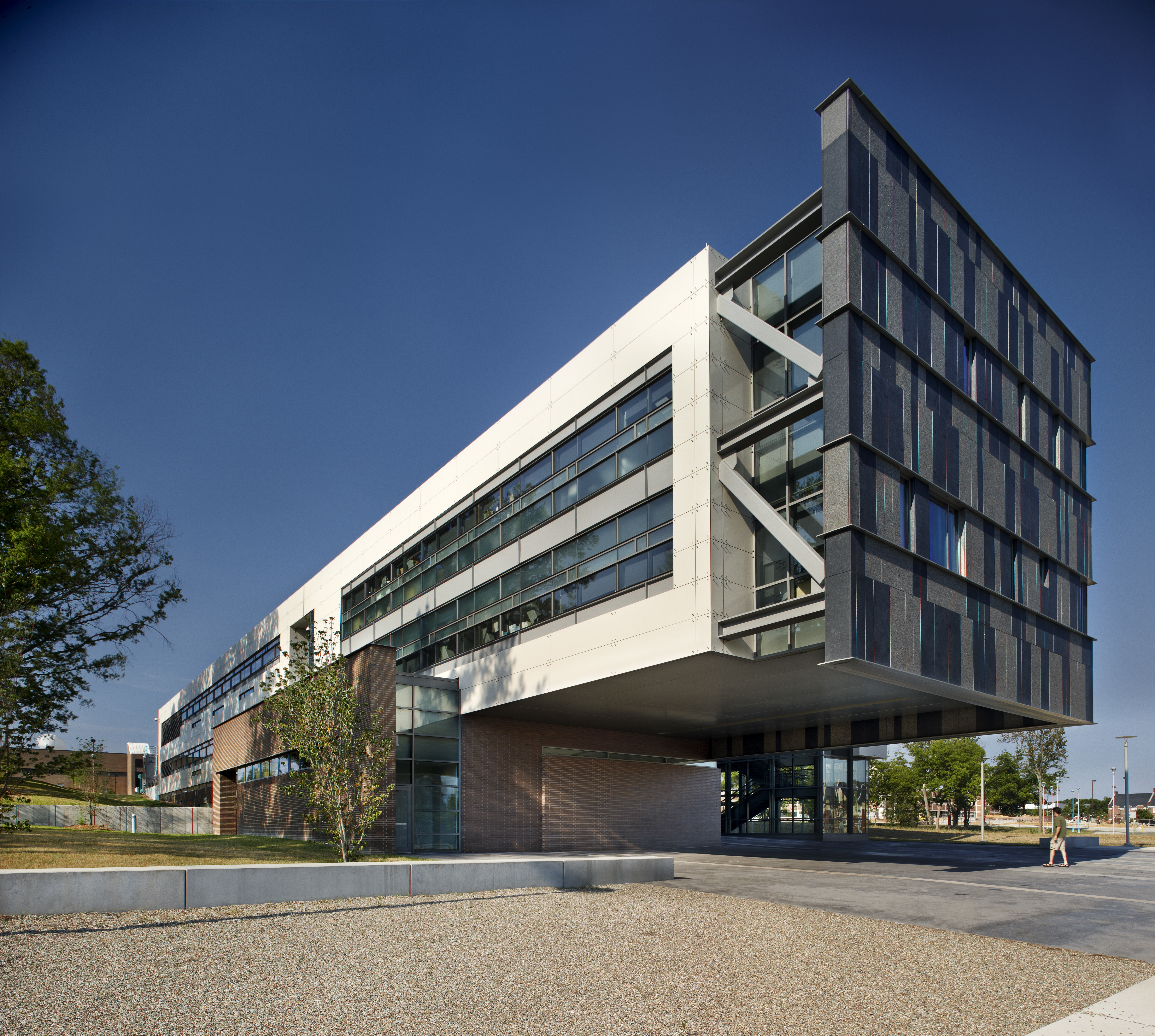The North Carolina A&T University’s Samuel D. Proctor School of Education building serves as a keystone in the revitalization of the university’s main campus. With a design meant to “wow”, the structure’s 52 ft long by 40 ft wide, two-story cantilever is a dramatic statement for the future of the university. In addition, an adjacent three-story entry lobby includes tiered open space, an architectural stairwell and a cantilevered glass canopy. Many of the building’s unique architectural features also required additional consideration from the structural engineer. These included facade elements such as ribbon windows running the full length of the building and the black slate veneer. This blend of architecture and structure within the building is the perfect showcase for the future of education at the university.