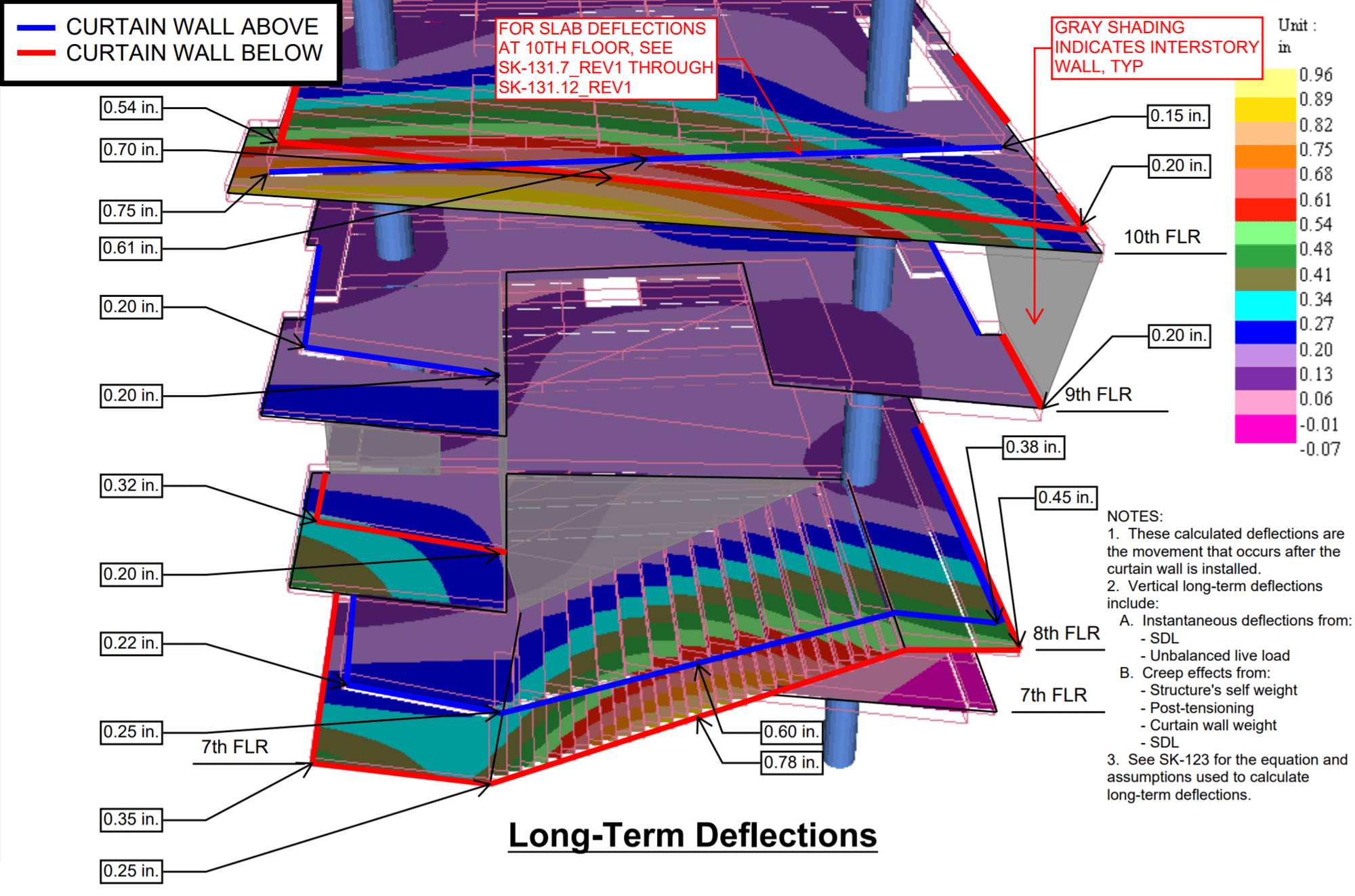 To design the complex conditions of the structure, specifically in the Study Cascade, engineers at LERA utilized ADAPT-Builder. The software’s multi-story features were utilized to capture the load-sharing effects at the cantilevered slabs that are connected by single-story walls and ramps. Additional challenges arose due to the interaction between the all-glass curtain wall and the cantilevered post-tensioned slabs. Early in the project, the design team settled on acceptable long-term deflection limits (1 ¼” inches for cantilevers up to 26ft) that were then utilized to tune the bonded post-tensioned slabs. Detailed deflection contour plots from ADAPT-Builder were used to coordinate deflections in the slab with the curtain walls above and below, ensuring that the stringent performance criteria was satisfied. Overall, the flexibility that ADAPT-Builder provides allowed engineers at LERA to model and analyze complex conditions with confidence, ensuring proper coordination as well as an efficient design.