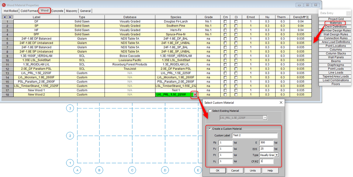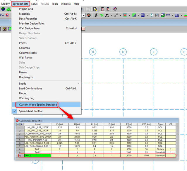 OPTION 3: Enter custom wood material in the toolbar Spreadsheets. Choose Custom Wood Species Database. Enter your custom wood properties here.