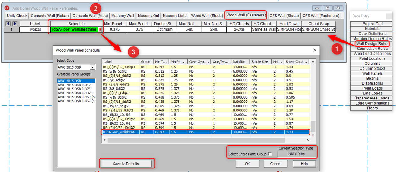 Similarly, edit your Sheathing Panels Schedule by choosing the Wall Design Rules spreadsheet in the Data Entry spreadsheets.