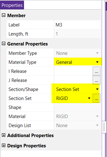 By default the program already has a rigid member set up for you within the section sets > general material. To use this member you can use the following settings when drawing your rigid links.