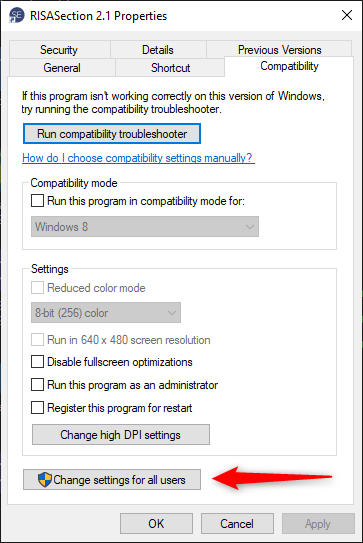 Then click on the Compatibility Tab and select the button to change settings for all users.