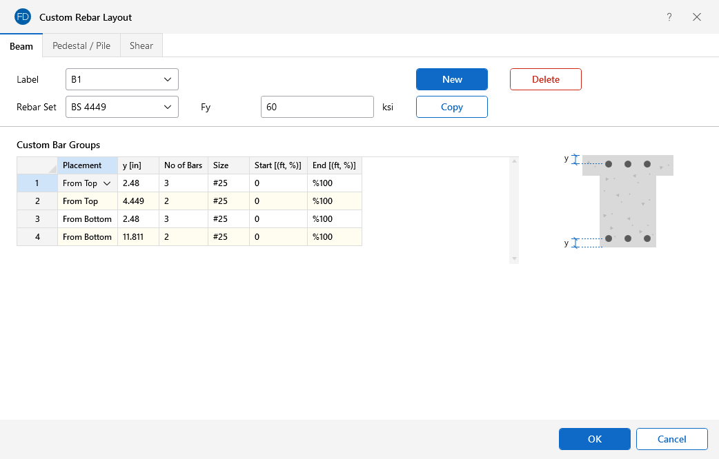 7. End [ft,%]: This is the distance along the length of the member where the reinforcement will end. This can be entered as a length or a percentage of the member’s length.