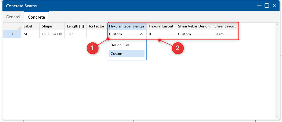 To apply your custom layout, select a member in the graphical interface and then in the "General Properties" section of the "Properties Panel" change the "Flexural Rebar Design" field to "Custom" while selecting your custom "Flexural Layout". You can also do the same for the "Shear Rebar Design" as well.