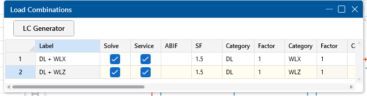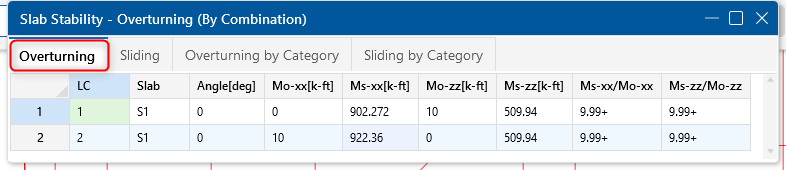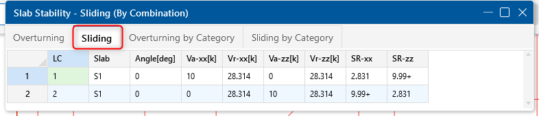 The slab Overturning and Sliding Safety Factor results are calculated by comparing the demand/resisting force in the slab’s local z and x directions. The SR-xx and SR-zz stability ratios are compared against the SF value in the Load Combinations spreadsheet. A value higher than 1.5 in this example means that the stabilizing forces are greater than the destabilizing forces and the mat is stable. (ce)