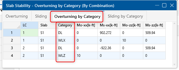In this example, the foundation support for a four leg tower has two load combinations applied for (DL + WLX) and (DL + WLZ). The breakdown in the Overturn/Resist by Category and Sliding/Resist by Category tabs show DL acts as a stabilizing force for both overturning and sliding while the wind loads in the X and Z directions act as destabilizing forces for overturning and sliding.